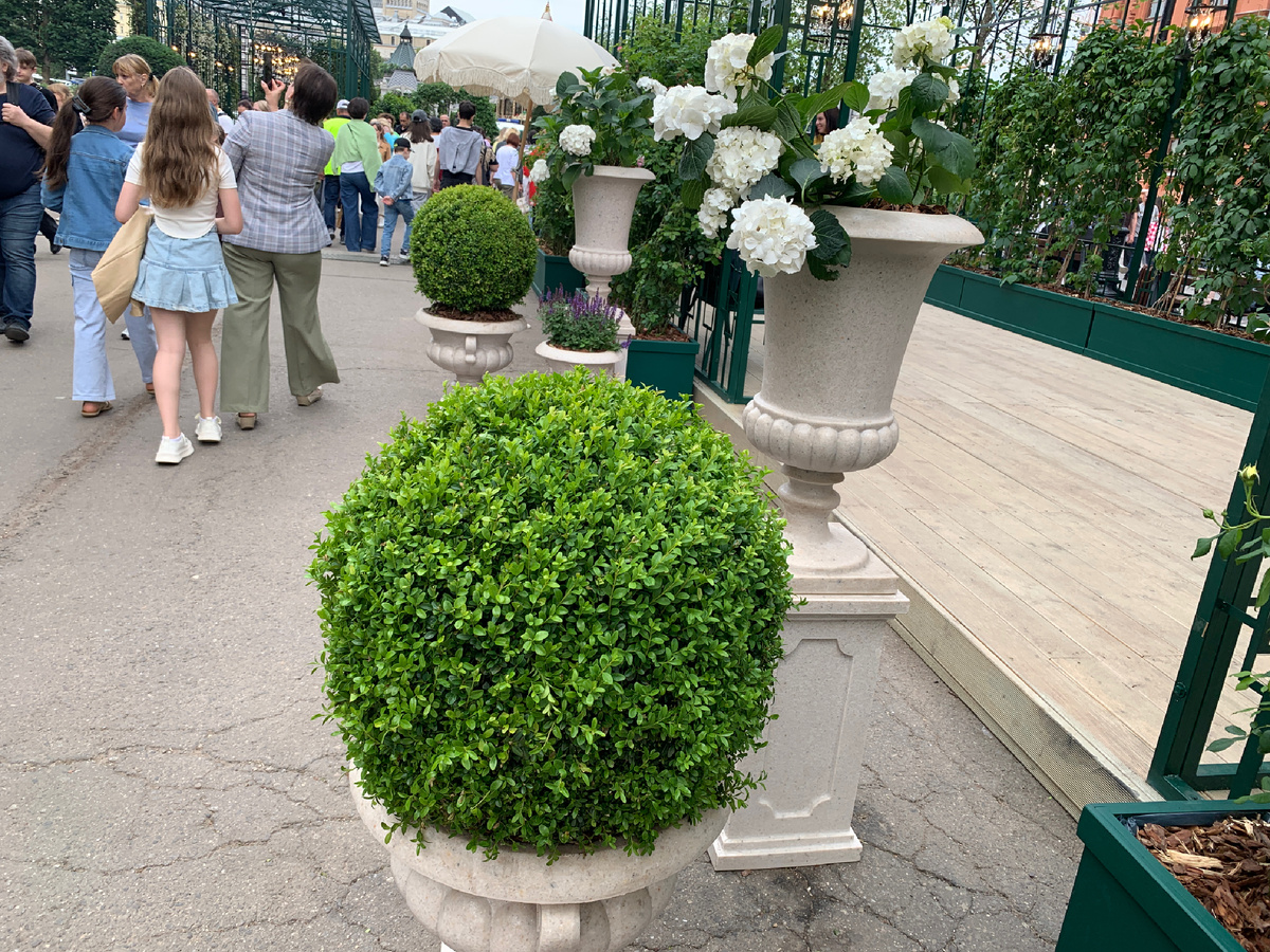 12-го июня распахнули свои объятья флагманские площадки фестиваля "Сады и Цветы". Манежную площадь я показала на видео, Описала в публикации "Винтажный маркет" на площади Революции. А сейчас мы пройдем по французскому саду от площади Революции до Манежной. Около этой красоты порою очередь любителей селфи Я прочла , что более выше 40 сортов роз украсили столицу в рамках фестиваля "Сады и Цветы" В павильонах, раскинутых по Французскому саду, можно попить, перекусить и приобрести сувениры. Топиари явно удались. Радуют красотой и разнообразием. Топиари довольно-таки сложная ручная работа. Они преимущественно имеют геометрическую форму. Но сейчас в городах России стало все больше появляться и фигурных топиари Берсо получилось не очень красивым. На верхней части берсо зелени маловато, лежит не плотно. Возможно, не все знают что такое берсо. Поясню- Берсо это садово-парковое сооружение, галерея, проход, образованный вертикальными стенами. Берсо п
