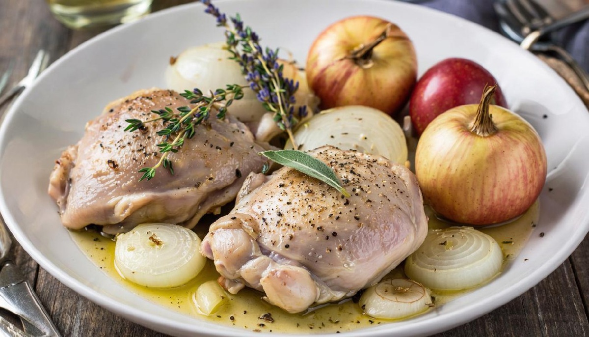 Знаешь, вчера лил такой осенний дождь — холодные капли стучали по подоконнику, а запотевшее стекло превращало фонари в золотые кляксы. И вдруг... аромат. Сливочно-луковый, с нотками карамели и тимьяна. Моя кухня пахла, как ресторан в Тоскане. А ведь я просто бросила в сковороду голени, лук и яблоки! Помнишь, как в детстве мама говорила: «Мясо с фруктами — это гадость»? Я верила лет 20. Пока не рискнула... ...Мой первый опыт с курицей и яблоками был позором. Филе стало резиновым, фрукты превратились в пюре, а вино горчило, как аптечная настойка. «Фу!» — сказал муж. «Бе-е!» — блеял кот. Озарение пришло от шефа-биохимика: «Яблочная кислота + жир = нежность. Но только если яблоки — твердые, а мясо — на кости!» Контраст: