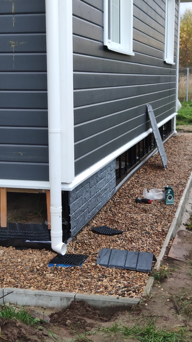 Октябрь 2022 Потихоньку начал монтировать цоколь. Надеюсь, успеть до снегов. В качестве цоколя - фасадные панели Döcke. Покупал еще в прошлом году. Надеюсь, что не обсчитался и хватит на все стороны. Обрешетка самая примитивная - из остатков стройматериалов. Где-то брус, где-то просто имитация бруса 16 мм толщиной, которую я сращиваю в 2 слоя и напиливаю, как доску. Затем крашу битумным лаком для защиты. Первый нижний ряд панелей по инструкции крепится на металлический стартовый профиль и его не видно за фасадом. Но у меня с 2ух сторон дома цоколь с уклоном (участок с перепадом высоты) и там не получится делать по инструкции, и я креплю J-планку (которая используется для закрытия торцов) и в неё вставляю низ панелей. Минус в том, что туда будет набегать вода. Я нарезал эти планки по 1.5 м, чтобы вода хоть как-то уходила. На сторонах с уклоном мне придётся подрезать почти полностью панели, оставляя полезным лишь небольшой кусок, в остальное выкидывать 🥴🥴 Одна панель стоит 500-