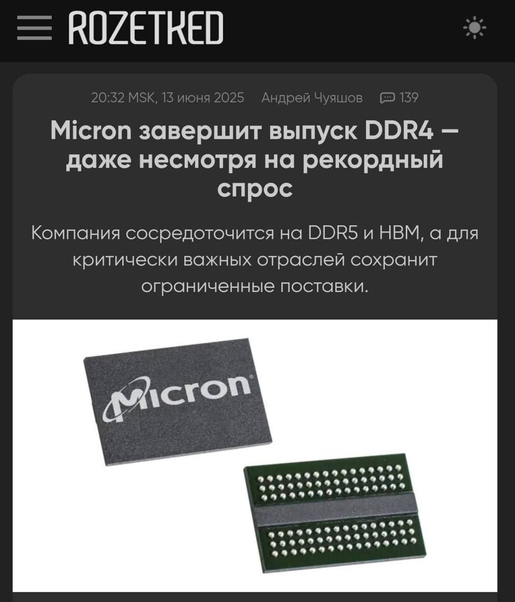 DDR4 официально ВСЁ — Micron прекращает выпуск модулей DDR4. Ранее от DDR4 отказались Samsung и SK Hynix. Теперь все три крупнейших производителя сосредоточатся на DDR5, LPDDR5 и HBM. Геймеров предупреждают: дефицит уже подстегнул рост цен на DDR4, так что про дешёвые сборки можно забыть.