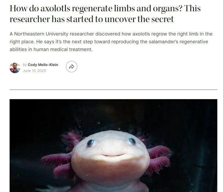 Росомаха почти реальна — ученые сообщают о достижениях в области полноценной РЕГЕНЕРАЦИИ у людей. Исследования проводились на аксолотлях: • У них были обнаружены два элемента, отвечающие за восстановление конечностей — ретиноевая кислота и ген Shox. • Ретиноевая кислота способствует восстановлению костей, суставов и мышц. • Ген Shox определяет, какая именно конечность должна вырасти. • Ученые утверждают, что и у человека есть потенциал для этого. У нас имеются все необходимые клетки, осталось лишь запустить этот процесс. NeuroFlux #ИИ #Технологии #наука #нейросети #ИнтернетСвобода #ИскусственныйИнтеллект