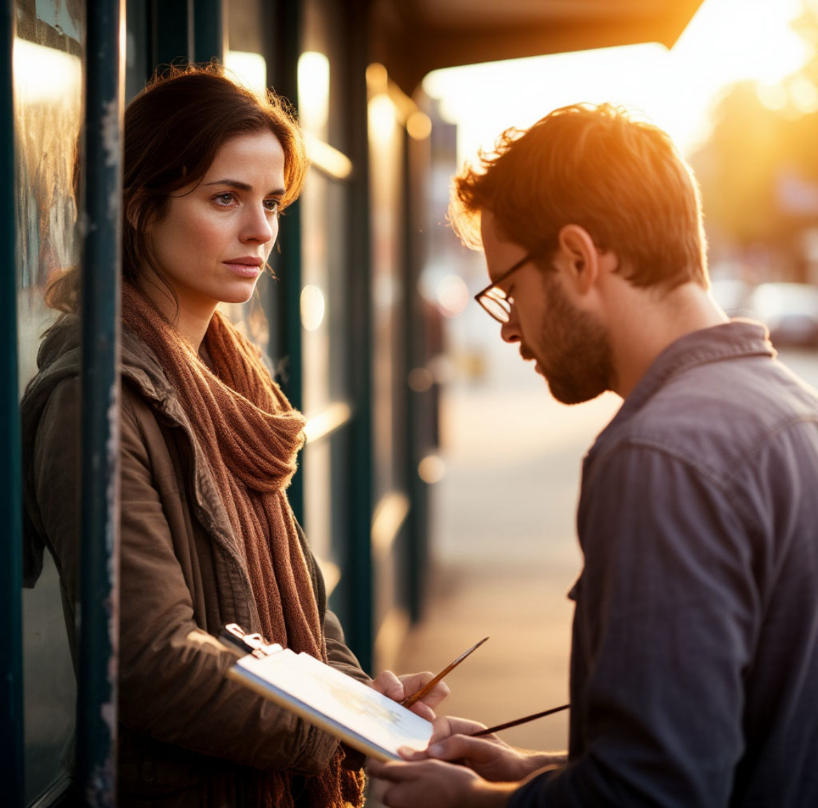 Странно: сегодня на остановке — солнце. Не теплом, а светом. И самое странное — мужчина с раскладным мольбертом, слишком яркий для этого утра. На вид — лет пятьдесят, аккуратная седая борода, руки крупные, с пятнами от краски. И вот он — рисует.