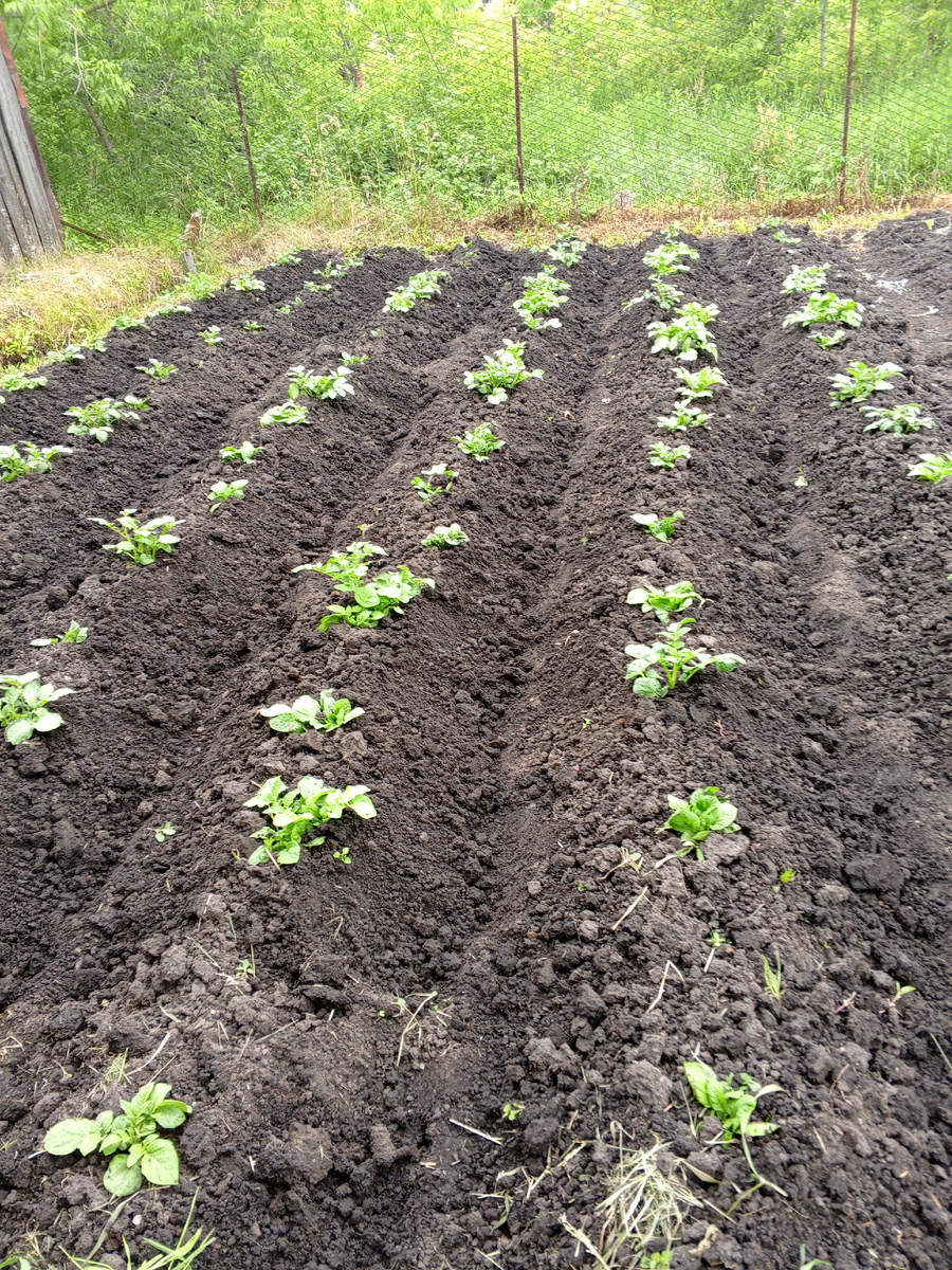 Этот загон картофеля муж сегодня начал окучивать,послезавтра продолжит,с этой стороны небольшая картошка а с той стороны к забору уже хорошая.