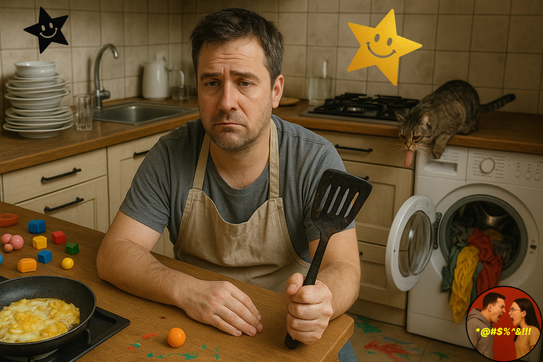 — А я думал, ты один раз посуду моешь, и всё чисто... И стирка! Я думал, закинул вещи в машинку — и готово. А оказывается, их потом развешивать надо, гладить...