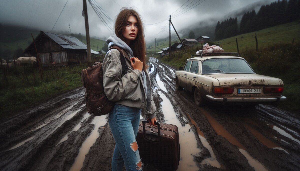 Дорога, если это месиво из глины и воды вообще можно было так назвать, выматывала. Алёна, чертыхаясь, тащила тяжеленную сумку, чувствуя, как ноет плечо. Новые ботинки превратились в два комка грязи и безнадежно хлюпали при каждом шаге.