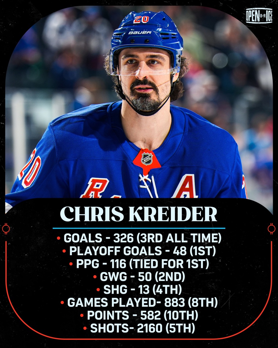 🥅 Крис Крайдер —легенда Без преувеличения можно сказать, что Крис Крайдер — легенда «Рейнджерс». Я помню плей-офф 2012 года.. тогда Джон Торторелла, тренировавший команду, выпустил парня, который до этого в НХЛ не провёл ни одной минуты. Конечно, от этого хоккеиста ждали много — он был выбран в 2009-м году под общим 19-м номером, но вот уже весна 2012-го года, а дебюта в НХЛ до сих пор не случилось. Крайдер не спешил — он поиграл три сезона за хоккейную команду бостонского колледжа. В аккурат после завершения третьего сезона был подписан контракт с «Рейнджерс». Вот так — из лиги H-East в плей-офф НХЛ. Травму получил Карл Хагелин, нужно было кого-то выпускать. Выбор пал на молодого Крайдера. Первой шайбы пришлось ждать четыре игры. В первых трёх время игрока плавало с 11 до 3,5 минут и обратно. После открытия счёта голам в четвёртой игре игровое время Крайдера только в серии с «Вашингтоном» опускалось ниже 10 минут. Всего в том плей-офф будущая звезда команды провела 18 игр, в котор