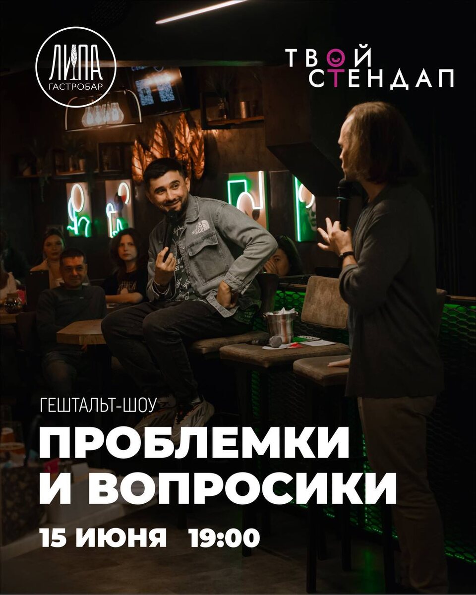 «Проблемки и вопросики» уже завтра! Начало в 19:00. Комики собирают анонимные записки из зала, с юмором отвечают на вопросы зрителей, шутят и делятся историями. Квалифицированный психолог разбирает запросы с точки зрения науки и практики. А мы, в свою очередь, порадуем вас вкусными блюдами и напитками. Ждём вас на гештальт-шоу «Проблемки и вопросики» в гастробаре «Липа»! 📍ул. Волжская, 28. Вход — 600₽ Бронь столиков👇: 89085477694