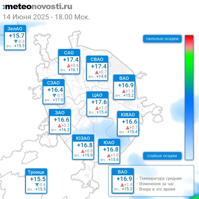 В 18:00 в Москве было от +14.9°C до +18.3°C, средняя температура +16.8°C #погода #Москва #лето #температура #14июня #суббота Перейти на сайт Прогноз погоды на 14 дней