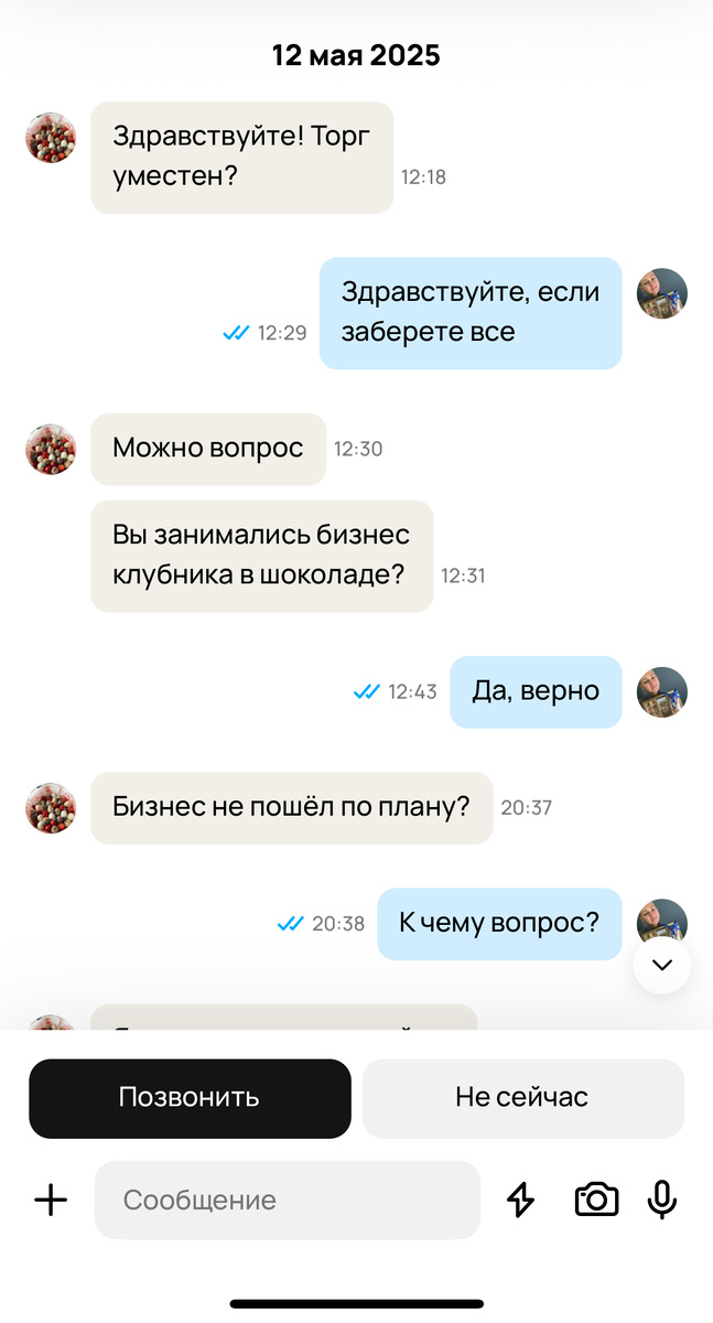 Доброго дня 👋 Эх, давно не писала посты, много времени прошло. Я съехала недавно с офиса, пока оборудование перевезла домой и часть оборудования начала продавать. Тут у меня наметился очень интересный диалог. Пишет мне мужчина с целью купить оборудование, так как он решил открыть точку клубники в шоколаде (честно, точно не поняла какую, но очень хотелось бы узнать). Начал спрашивать меня о бизнесе, я посчитала, что вопрос неуместен, почему я незнакомому человеку что-то должна рассказывать. Диалог далее перешел в Вотсап. На самом деле, манера общения его мне ужасна неприятна - звонки в 23-24ч ночи! И в 7 утра, сообщения каждые 15 секунд, звонки, если не отвечаю сразу. «Фонарик для сфоткать клубника» вообще топ 👍😂 Но так как я шоколадом еще занимаюсь, часть оборудования я оставила себе, а мармиты решила ему продать, очень настойчиво он о них спрашивал) Для понимания, свои мармиты я покупала за 8.000рублей с копейками. Вот они (ванночки объемные, мармиты удобные, температуру держат