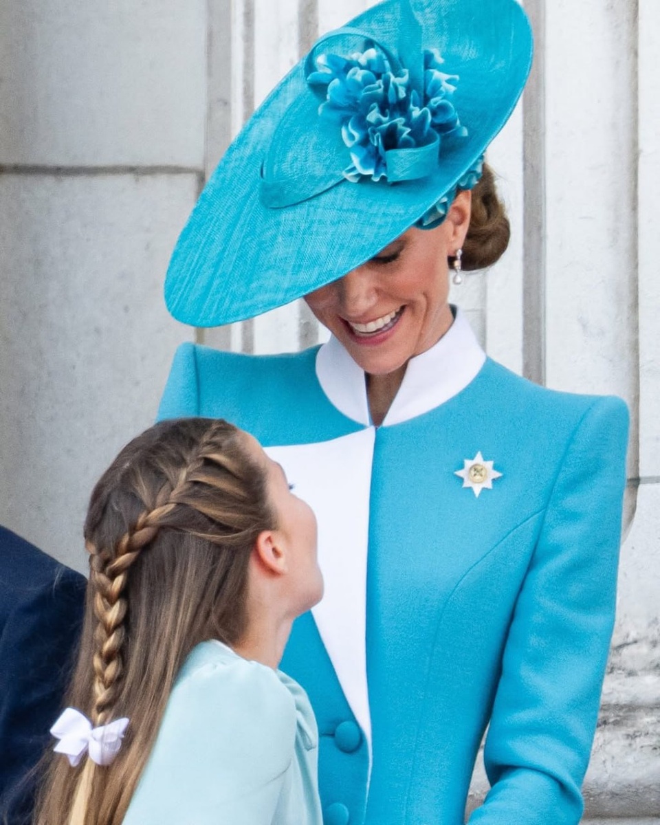 Кэтрин Миддлтон посетила ежегодный парад Trooping the Colour, приуроченный к официальному дню рождения короля. Этот день, как правило, не привязывается к настоящей дате рождения монарха (Карл III родился 14 ноября) и назначается на май-июнь, когда бывает хорошая погода. Для мероприятия принцесса Уэльская выбрала аквамариновое платье Catherine Walker — одного из любимых брендов принцессы Дианы. Образ она дополнила шляпой-таблеткой Juliette Botterill Millinery, выполненной в том же оттенке, и жемчужными серьгами, которые принадлежали королеве Елизавете II. Дочь Кэтрин Миддлтон и принца Уильяма, принцесса Шарлотта, была одета в платье той же цветовой гаммы. На прошлом параде Trooping the Colour у них также были сочетающиеся образы, как и у леди Ди и маленького принца Гарри на том же мероприятии в 1988 году.
