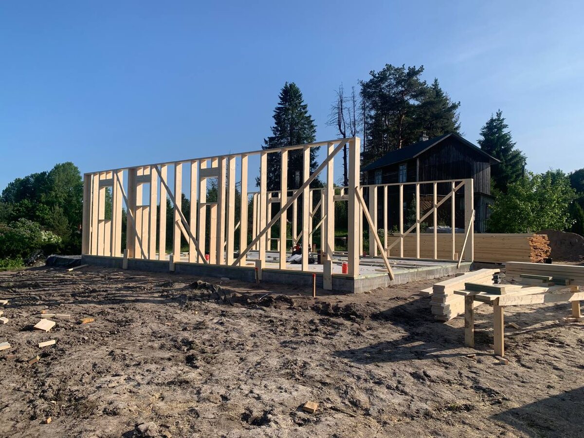 Смонтировали лежни, обработав антисептиком глубокого проникновения. Установили пару внешних стен. Использована доска сечением 45х195мм. Больше проектов тут: https://t.me/proektidomikov