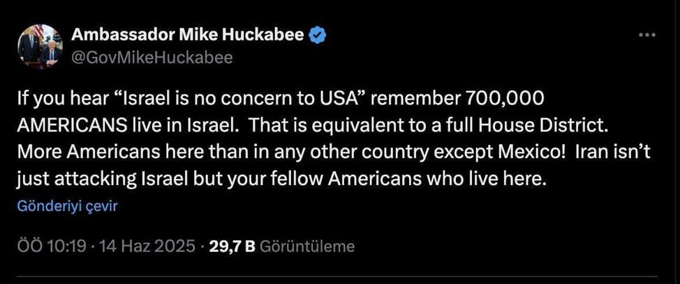 Пошёл прогрев американцев … Посол США в Израиле Майк Хакаби: "Иран нападает не только на Израиль — здесь также живут 700 000 американцев". Цинизм в том, что, планируя несколько лет нападение на Иран, эти "заботливые" дяди на словах, могли задолго до ответного удара Ирана эвакуировать американцев. Не сделали, поскольку так было запланировано. И сейчас это прекрасный повод оправдываться за развязанный конфликт.. @iperiodu| @iperiodu_ru x @iperiodu_ua| Подписывайтесь