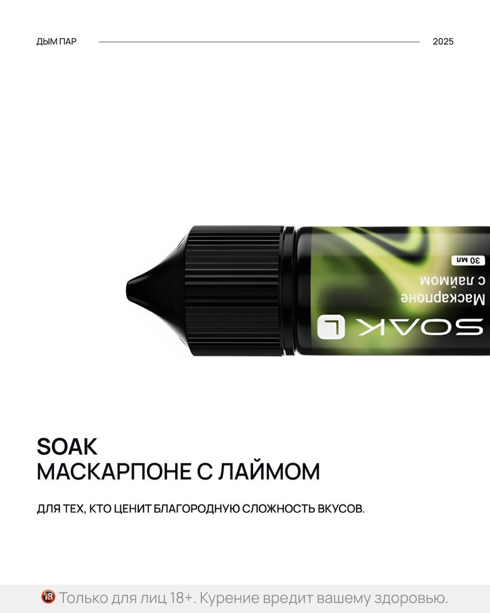 SOAK «Маскарпоне с лаймом» — летний дуэт итальянской нежности. 🍰 Маскарпоне — король десертов. Идеальный ингредиент для тирамису и чизкейков премиум-класса. В этой жидкости — его бархатистая сливочность, дополненная ярким акцентом лайма. 🍋 Лайм — свежесть в каждом аккорде. Освежает, как морской бриз, и добавляет пикантности сливочной основе. 🍬 Сладость: 4/5 🍧 Свежесть: 2/5 Вкус напоминает: Десерт «Лаймовый чизкейк». Охлажденный лимонад с каплей сливочного сиропа. 📍Попробуйте этот и другие вкусы SOAK в бутиках Дым Пар. 🔞Только для лиц 18+. Курение вредит вашему здоровью.
