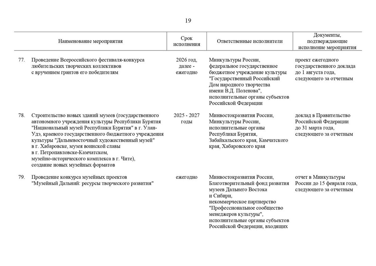 План культуры ❗️Правительство утвердило план мероприятий по реализации в 2025–2027 годах Стратегии государственной культурной политики. ➡️Всего документ содержит 200 мероприятий в 8 разделах. Особый профильный для нас интерес представляют два: 🔹III блок предполагает реализацию мероприятий, связанных с совершенствованием системы подготовки творческих кадров, формированием и поддержкой кадрового потенциала в сфере культуры. 🔸Частично – VII блок (в части научных исследований). ➡️План так же широк по количеству взаимосвязанных сюжетов, как и сама Стратегия государственной культурной политики на период до 2030 г. В плане проведена декомпозиция и последующая пересборка некоторых постулатов Стратегии. ➡️С другой стороны, каждый такой план к той или иной стратегии – это декларация проблемным мест. И часть из них должны были решаться еще до того, как началось формирование планы, а то и до утверждения самой Стратегии. ➡️Среди исполнителей ожидаемо доминирует Министерство культуры и чуть м