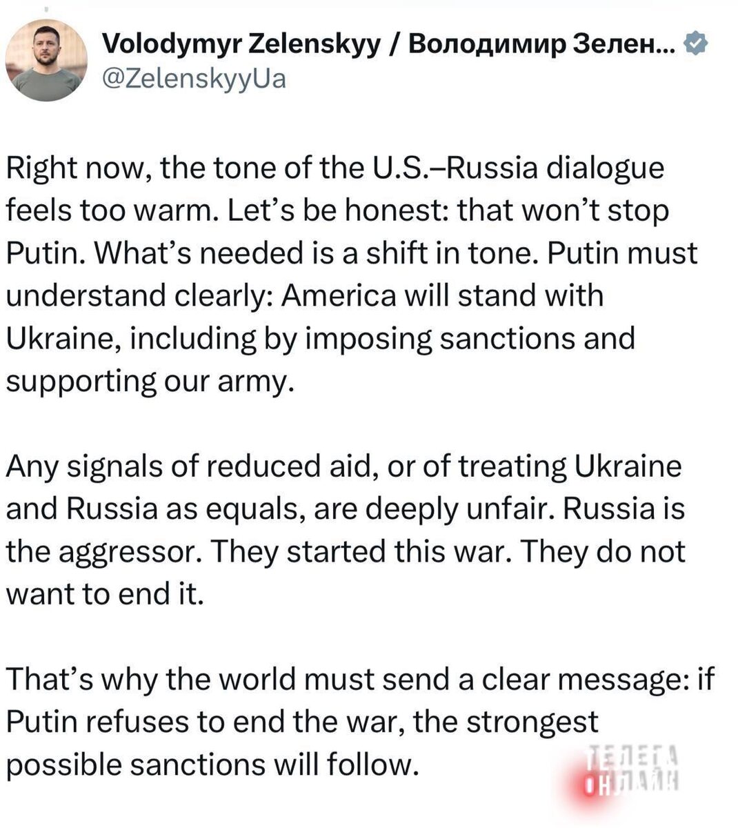 Можно жестче? Владимир Зеленский обиделся на США за то, что те, по его мнению, разговаривают с Россией «чересчур мягко»: Тон диалога между США и Россией чересчур мягкий. Это не остановит Путина. Нужна смена риторики. Америка должна поддерживать нас — санкциями и оружием. Когда за тобой горы оружия и миллиарды помощи, но толку мало, остается только одно: громко требовать еще. А если в ответ говорят спокойно — это уже предательство. 🚲 Подпишись на Телега Online