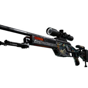SSG 08 — недорогая снайперская винтовка, отличное решение для ранних раундов. Скин «Dragonfire» изображает монструозного дракона, изрыгающего пламя, выполнен в красно-оранжевых и синих оттенках с геометрическим узором на стволе.