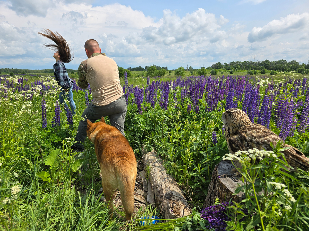 Сова филин Ёль почти довольна прогулкой, только рыжий понаехавший бесил немножко.