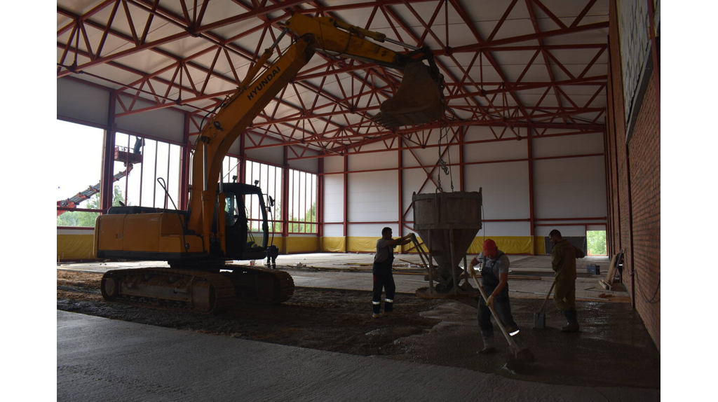 Сейчас в спортзале устанавливают окна – витражи. Основание пола заливают бетоном.