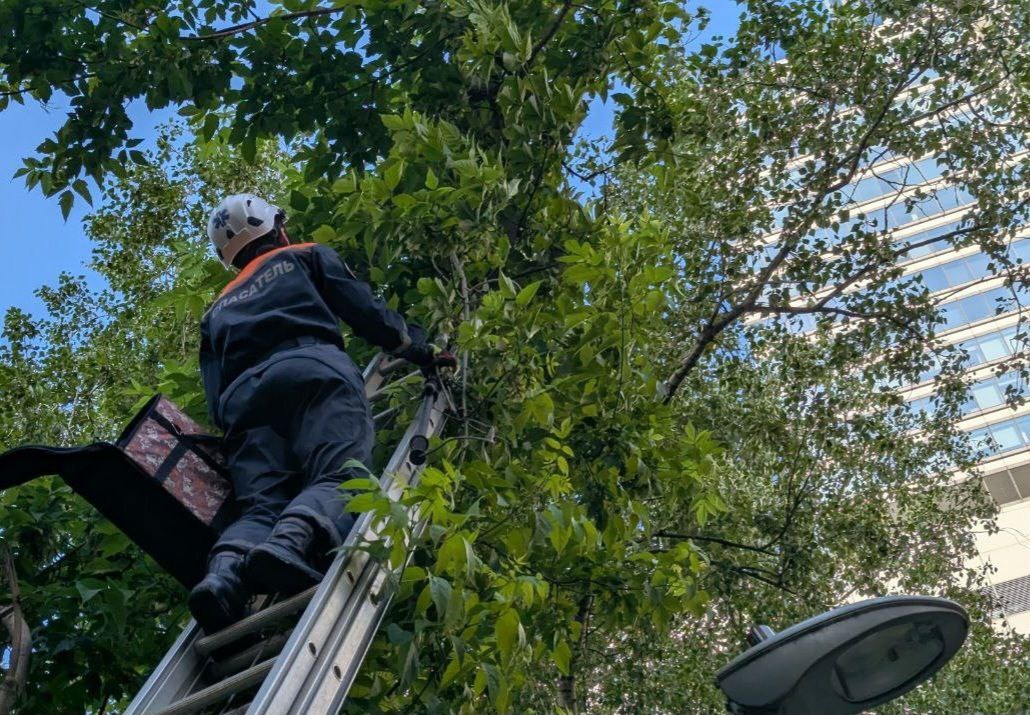 Испольщуя лестницу сняли с дерева и вручили хозяйке домашнего кота.