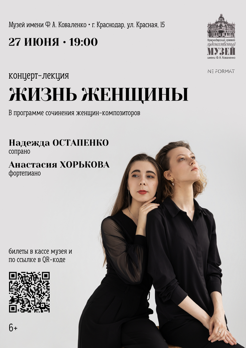 27 июня выступаем с NEFORMAT в музее имени Ф.А. Коваленко. Концертная программа «ЖИЗНЬ ЖЕНЩИНЫ» — про женщин-композиторов и их музыку, которая звучала — и звучит — несмотря и вопреки. 📍 Краснодар, ул. Красная, 15 🕖 27 июня в 19:00 🎟 купить билеты 6+ В программе сочинения Клары Шуман, Фанни Мендельсон, Мел Бони, Полины Виардо и других женщин-композиторов, чьи имена редко можно увидеть на афишах, но чья музыка по-настоящему трогает. ИСПОЛНИТЕЛИ: 🎤 Надежда Остапенко (сопрано) 🎹 Анастасия Хорькова (фортепиано) [NE]FORMAT — это про камерную музыку, живую подачу и атмосферу вдумчивого диалога со слушателем. Наши концерты проходят в особняках, галереях и культурных пространствах Петербурга, Москвы — и вот теперь Краснодара. Приходите сами, зовите друзей! До скорой встречи ❤️