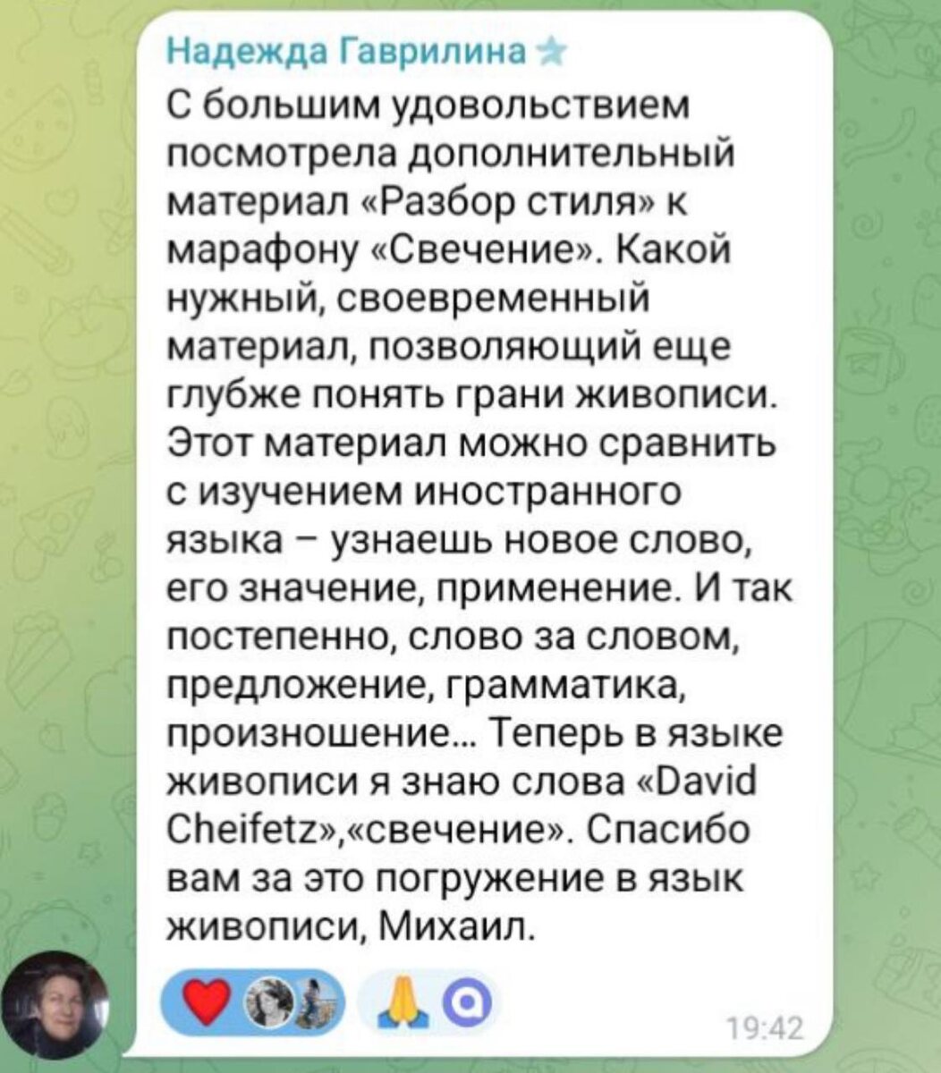 Для меня всегда очень важно получать обратную связь, особенно когда пробую новые идеи. Огромная благодарность за отзывы о «разборе стиля». Это новый формат который я ввел на прошлом марафоне «свечение». На нем я делюсь мнением о стиле Дэвида Чейфисе, показываю как лично я делаю разборы художников для себя, и комментирую о победах и неудачах художника. Марафон "Свечение" https://paint.art-class.online/glow?utm_source=tg_post