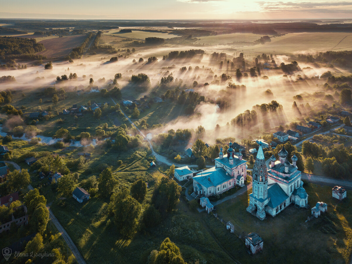 А как часто вы встречаете рассвет по-настоящему? Не просто встаете утром и едете на работу, мечтая поскорее вернуться домой, а остаетесь наедине с природой в те волшебные минуты, когда мир только просыпается? На рассвете происходят настоящие чудеса — обычные места преображаются до неузнаваемости. Особенный свет, особенная тишина, особенные ощущения. Честно говоря, я фанат рассветов, хотя и люблю поспать. Поэтому предлагаю немного полетать над небольшими селами и городами, окутанными дымкой тумана. Все снимки сделаны с высоты птичьего полета. Одна из самых любимых фотографий снята в этом селе Ивановской области. Повезло застать довольно плотный туман, через который пробивались лучи рассветного солнца. Парское — одно из старейших сел региона, первое упоминание относится к 1399 году. В XIX веке село славилось своими калачами, которые продавались даже в Москве, а на территории поселения находится 7 церквей. Если хотите увидеть провинциальную Россию почти в том же виде, как она была в начал