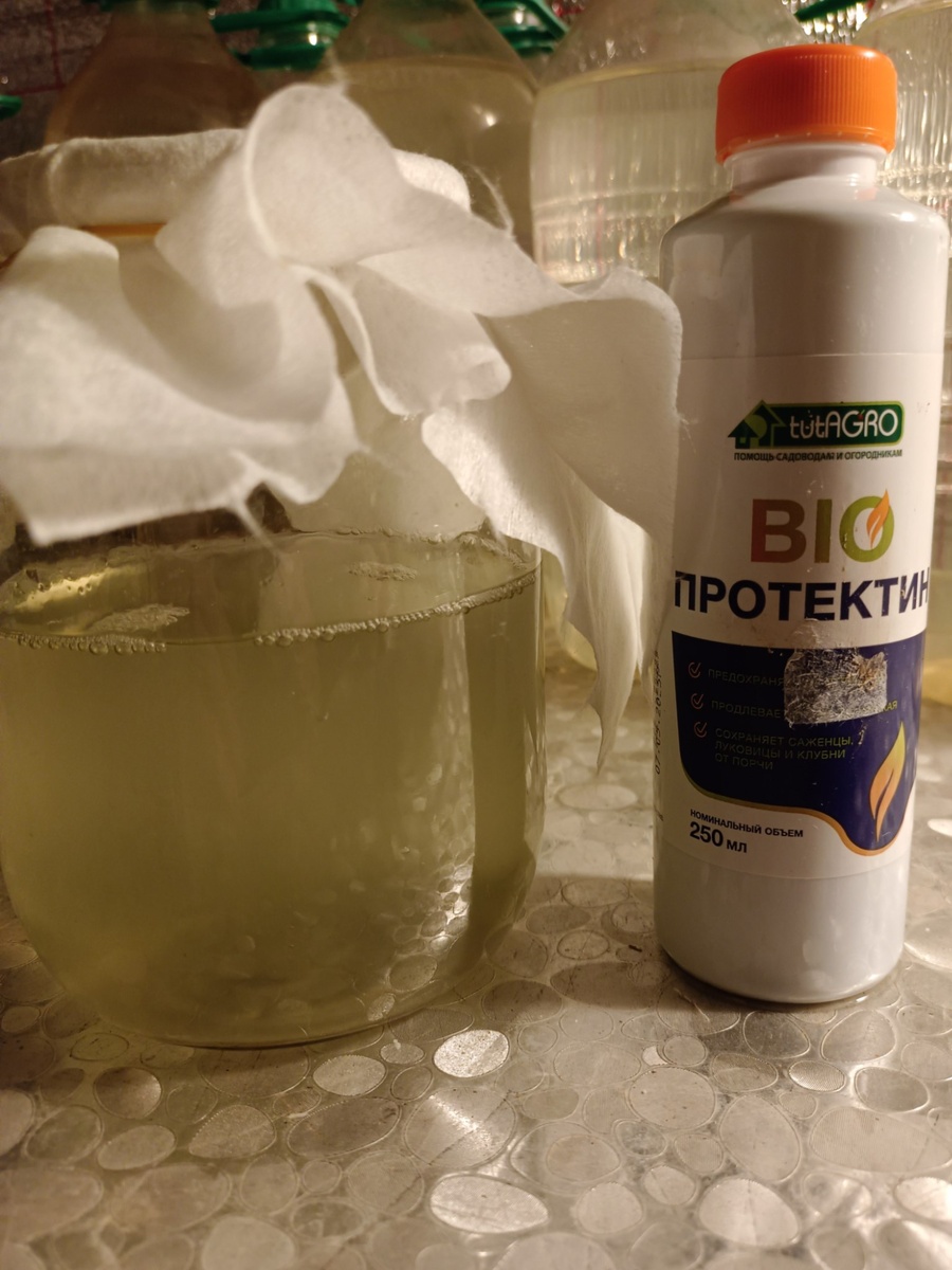 Получил «Протектин». Действовую по инструкции: 50мл растворить в 500мл картофельного отвара, накрыть и ждать несколько суток. Пока эта смесь микроорганизмов там расплодится. Всё равно опрыскивать, при таких дождях, сейчас бесполезно. Поэтому подготовим вариант своего "выращенного" маточного раствора.