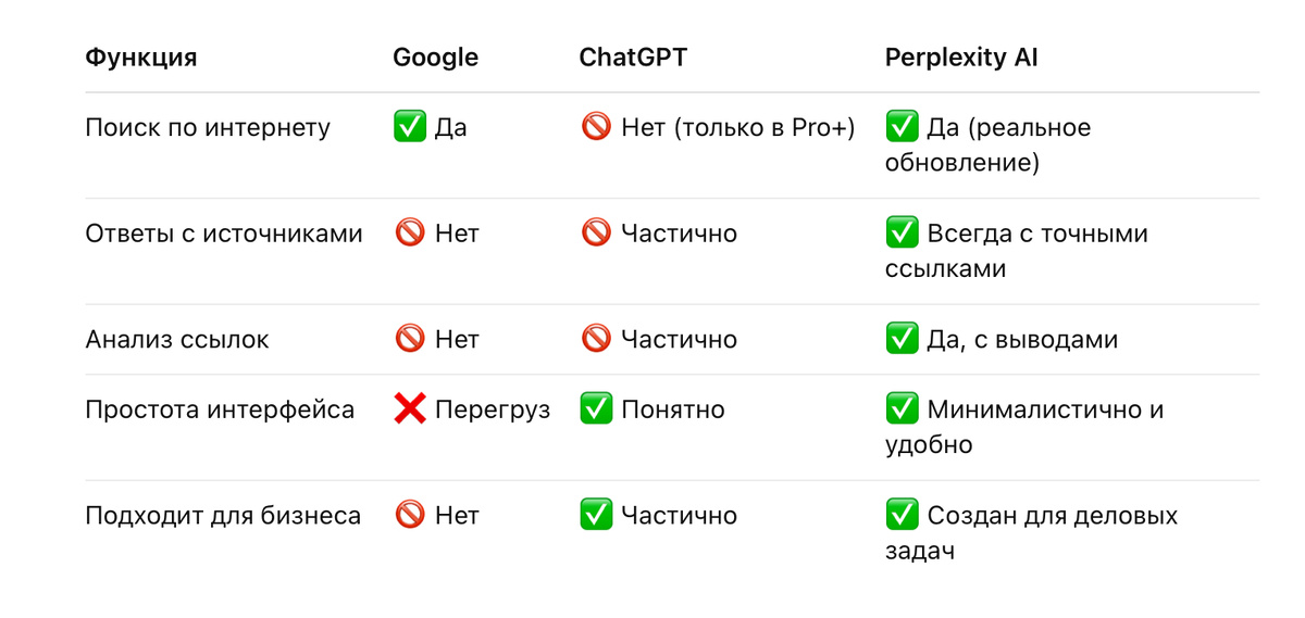 Пока ты читаешь эту статью, кто-то уже делегировал своему ИИ-ассистенту маркетинг, аналитику и стратегию. И зарабатывает на этом. Причём быстро. Почему все топы, венчурные инвесторы и стартаперы говорят о Perplexity AI? Потому что это больше, чем просто нейросеть. Это — новая модель мышления. 📌 Что такое Perplexity AI? Perplexity AI — это искусственный интеллект нового поколения, который сочетает в себе: Проще говоря, это Google, ChatGPT и аналитик McKinsey в одном окне. 🔍 Чем Perplexity отличается от ChatGPT и Google? 💡 Что Perplexity умеет 🧠 1. Собирать информацию по конкретному запросу «Сравни модели вытяжек Elica и Teka по характеристикам, отзывам и ценам» → Через 5 секунд: подробная таблица, вывод и ссылки на источники. 📊 2. Делать аналитику по рынку «Дай обзор рынка частного домостроения в РФ за последние 2 года» → Агрегация отчётов, тенденции, прогнозы, инфографика. ✍️ 3. Генерировать тексты на основе реальных фактов «Напиши статью о влиянии микродозинга вита