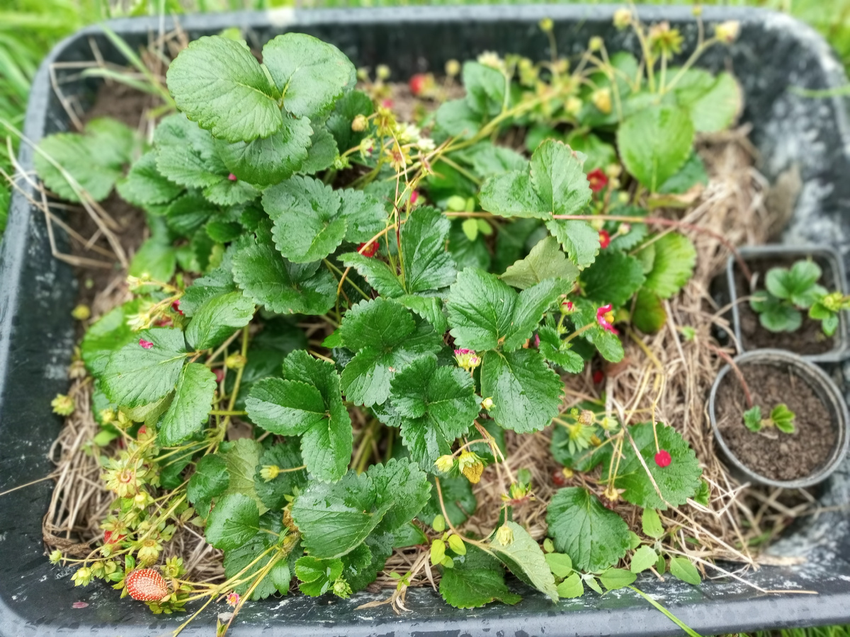 В начале мая купила ампельную клубнику Тристан, цветущую, в горшочке, получилось рассадить её на три куста. Она была уже с ягодками. Клубника вовсю плодоносит, краснеет, внуки с удовольствием её кушают. Уже появились усы, и конечно, я её укореняю, отросточек сразу цветет, думаю, что и здесь будут ягодки. Укореняю и второй ус. И третий уже на подходе. Все усы буду укоренять, к концу сезона будет много отростков. А тем временем и наша клубничка уже на подходе. Даже уже краснеет.