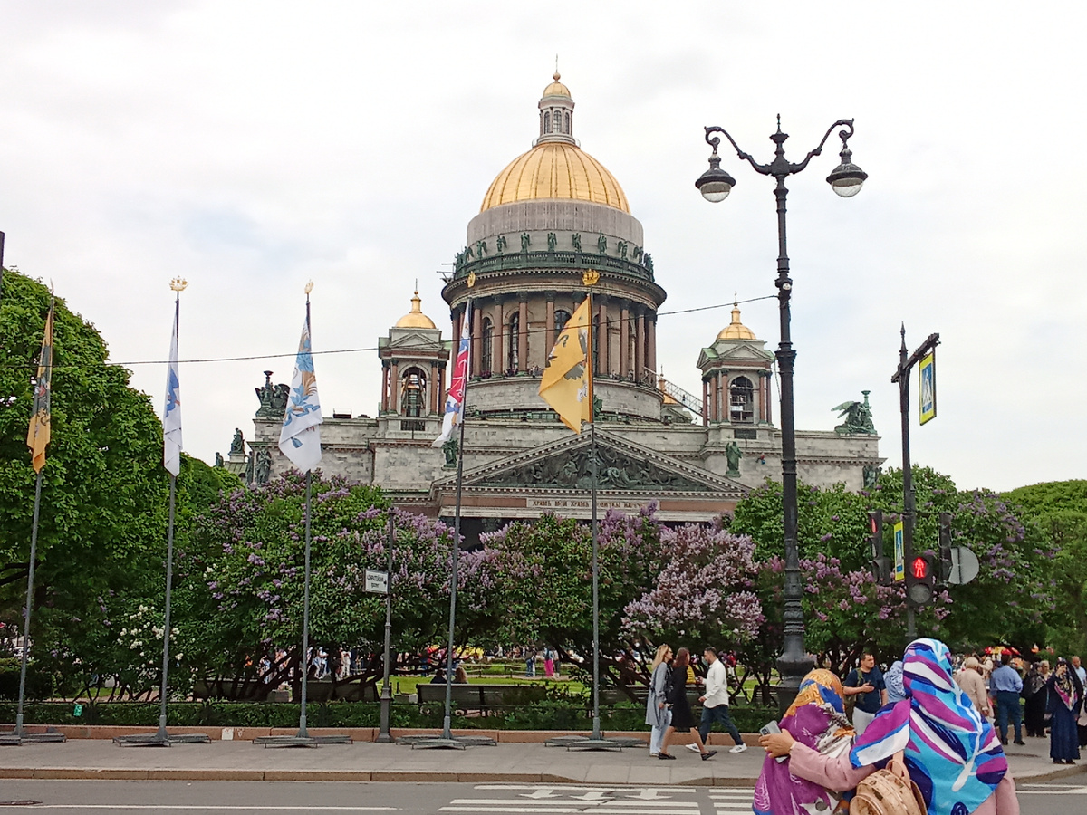 Наткнулись на сад-трансформер возле Мариинского дворца, когда с мужем нацеливались посетить Военно-морской музей на площади Труда. Заодно осмотрели в очередной раз достопримечательные места на Исаакиевской площади в будний июньский день Православный храм, творение Монферрана, в любое время великолепен. Создан на века и нам остается только любоваться и поражаться таланту архитектора и труженикам, работающим над возведением этого шедевра Возле храма всегда многолюдно. Все хотят полюбоваться творением Монферрана. Вон там, справа от колонн в блокадные годы жители города выращивали капусту Холодно было и хорошо, что мы взяли зонт. Он нам потом пригодился на обратном пути после посещения музея. Если в полдень было еще более-менее тепло, то к вечеру - просто холодина и дождливая морось... Так вот! Кусты сирени на Исаакиевской площади придавали романтичность июньскому полдню в этом месте и пленяли своим ароматом. Горожане и гости города радовались наступлению лета. Атмосфера была праздничная.