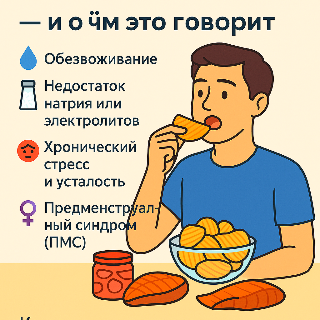 Организм может таким способом подавать сигналы. Рассказываем, что кроется за тягой к солёному и когда стоит насторожиться. Соль помогает задерживать воду. Если ты теряешь много жидкости (жара, спорт, недосып) — мозг может провоцировать желание солёного. Часто бывает при усиленном потоотделении, поносах, рвоте или при приёме диуретиков. Кортизол, гормон стресса, влияет на работу надпочечников. А они — на баланс натрия. В итоге: тебе хочется «восстановить баланс» через солёное. У женщин перед менструацией часто наблюдается задержка жидкости и изменение вкусовых предпочтений — особенно тянет на сладкое и солёное. Интенсивные вкусы (солёное, острое) стимулируют выработку дофамина. Это особенно выражено у людей, склонных к еде «на эмоциях». Это может быть признаком нарушения водно-солевого обмена, проблем с почками или надпочечниками. Желание съесть что-то солёненькое — не всегда просто прихоть. Иногда это язык тела, который просит о помощи. Важно научиться его слушать. Подпишись на «Красот