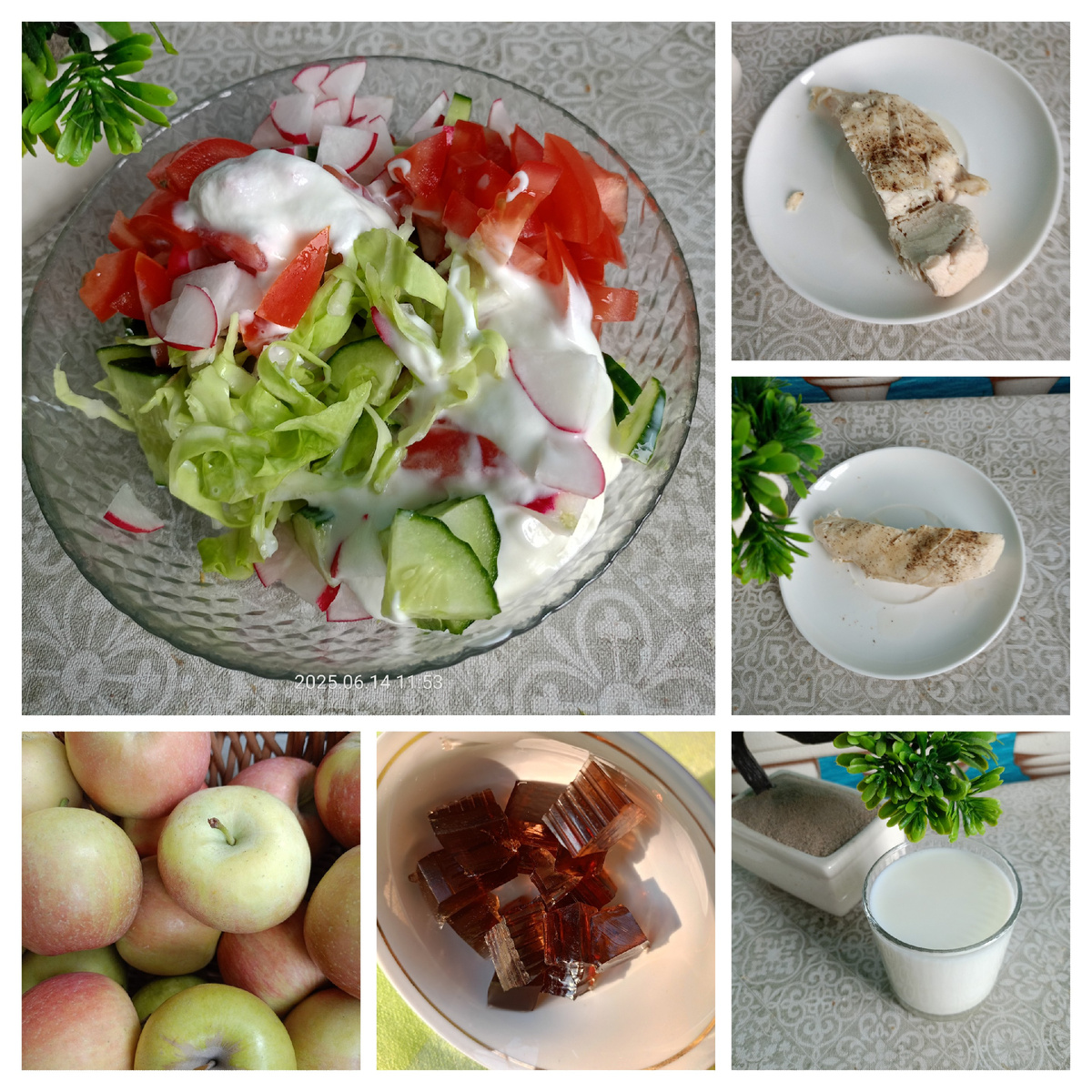 Всем привет! С Вами Татьяна, пенсионерка. Мне 74 года, рост 151 см, вес 56 кг. 27.02.23 мой вес был 82 кг. В процессе своего похудения за 2 года сбросила 25 кг лишнего веса. Цель - нормальный вес 55-56 кг, так как при моем росте 151 см 57 кг для меня избыточный вес. Факт 467 ккал Норма 500 ккал Фактическое БЖУ 40/25/35 Рекомендуемое БЖУ 25/25/50 *** Утром натощак стакан воды с просфорой Завтрак - салат из молодой белокочанной капусты, помидора, редиски, огурца с мацони; куриная грудка на пару. Обед - салат из молодой белокочанной капусты, помидора, редиски, огурца с мацони; куриная грудка на пару. Перекусы - кефир, яблоки, желатиновые кубики из каркаде. Физическая активность сегодня: Вечером ходила в храм на воскресную всенощную службу. За день 6028 шагов. ***