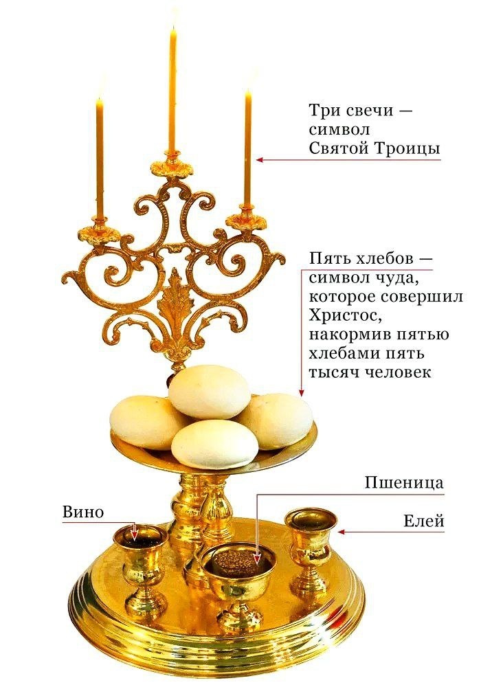 На ней лежат пять хлебов, а в стаканчиках находятся пшеница, вино и елей (оливковое или то подсолнечное масло). Батюшка же в предшествии свещеносца (пономаря с зажженной свечой) выходит в притвор церкви, где служатся определенные молитвословия.