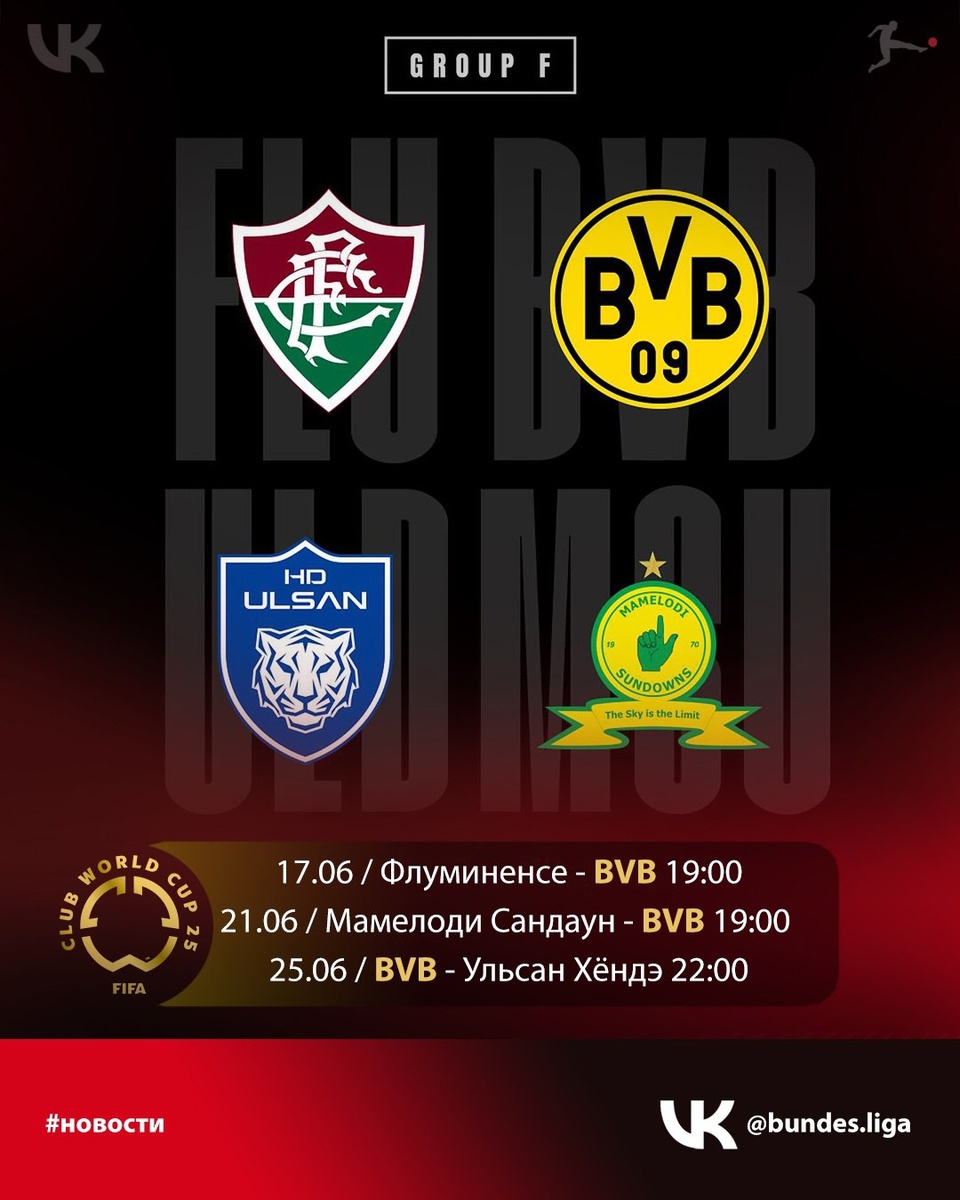 Группа F ⚽ «Флуминенсе» (Бразилия), «Боруссия» (Дортмунд), «Ульсан Хёндэ» (Южная Корея) и «Мамелоди Сандаунз» (ЮАР) — участники группы F