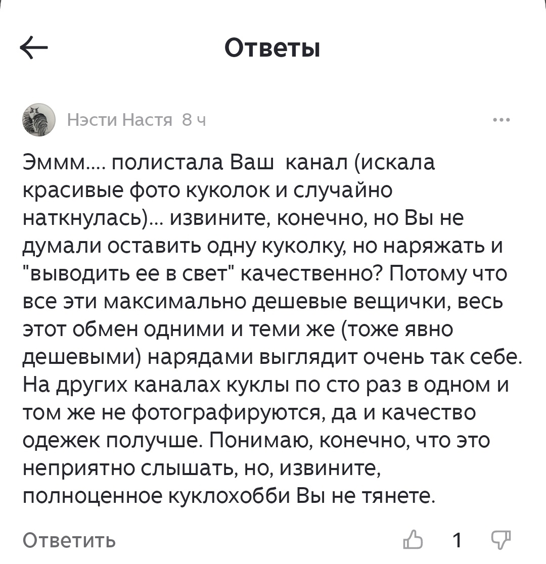 Но если разобрать коммент по существу, то вот, что бы я хотела сказать. Во-первых каждый из нас ведёт свой блог так, как он хочет. Так, как чувствует. Все мы нежно любим своих кукол, наряжаем их, придумываем им истории. Это по сути наше отражение, нечто глубоко личное. Но выставляя это самое личное на всеобщее обозрение, мы подчас становимся жертвами вот таких вот токсиков, хейтеров, хамов.