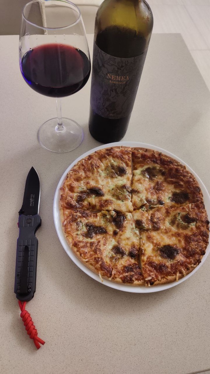 Пицца — размороженная из морозилки, вино — из Греции… Только нож итальянский, потому и положен рядом — для антуража.