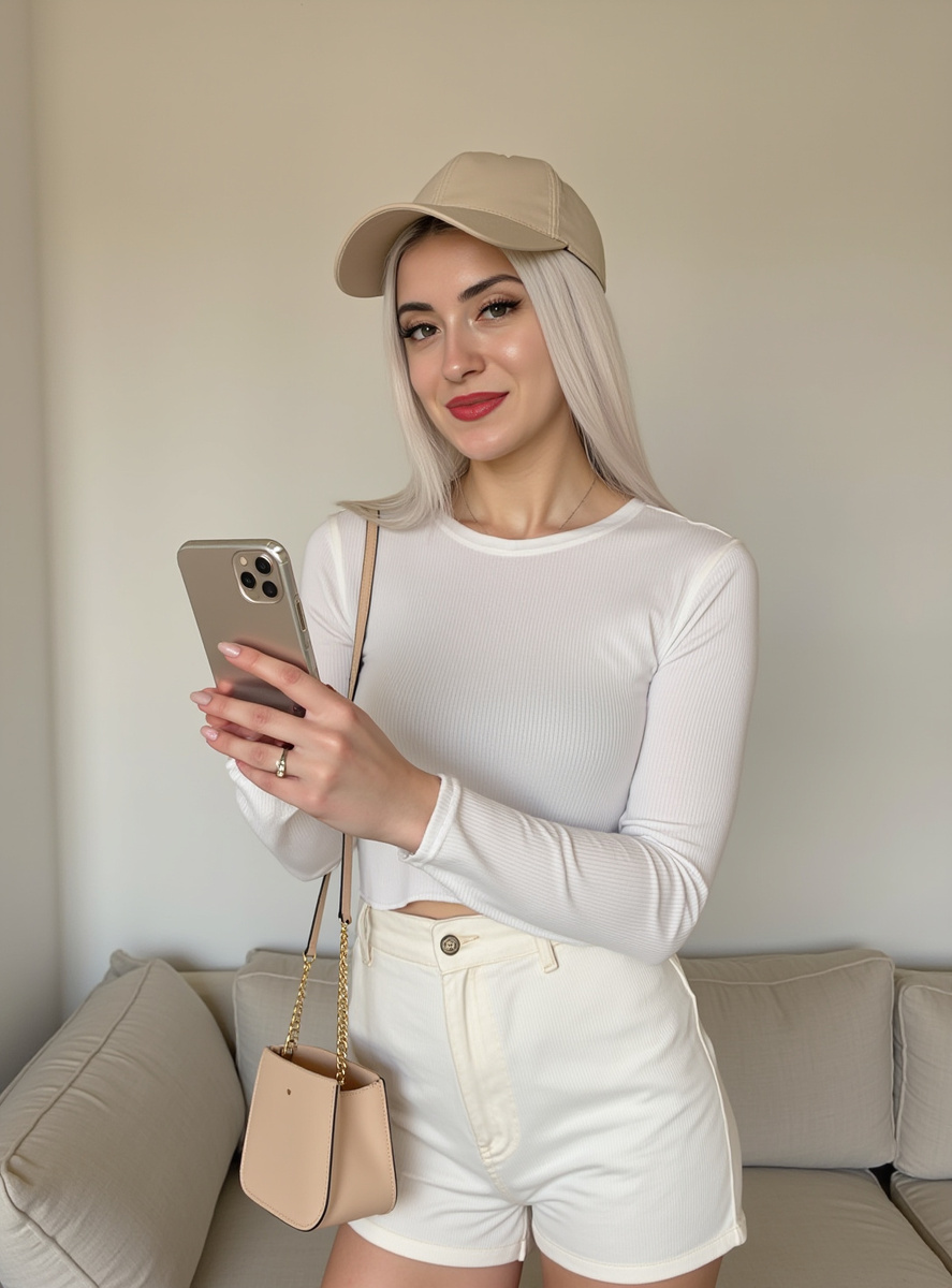 *¨༺ ПРОМТИК ༻¨* Стильная женщина с белоснежными волосами стоит в непринужденной позе перед стеной, оформленной в стиле минимализма и приглушенных тонах. На ней белая рубашка в рубчик с длинными рукавами и белые шорты в тон, а через плечо перекинута простая бежевая сумка. Ее кепка придает ей непринужденный вид, а в руках она держит смартфон, слегка повернутый для съемки селфи. Освещение мягкое и естественное, подчеркивающее гладкую текстуру ее одежды и нежные тона интерьера. На заднем плане - спокойная, нейтральная комната с мягким диваном, дополняющим умиротворяющая атмосфера. Изображение выполнено в реалистичном, высококачественном стиле с мелкими деталями и гладкими текстурами. **************** Предлагаю неповторимые, уникальные и необычные нейрофотографии. С радостью помогу реализовать Ваши задумки, пожелания и мечты благодаря индивидуальной нейрофотосессии! Консультацию провожу бесплатно, в ней я рассказываю, на каких условиях