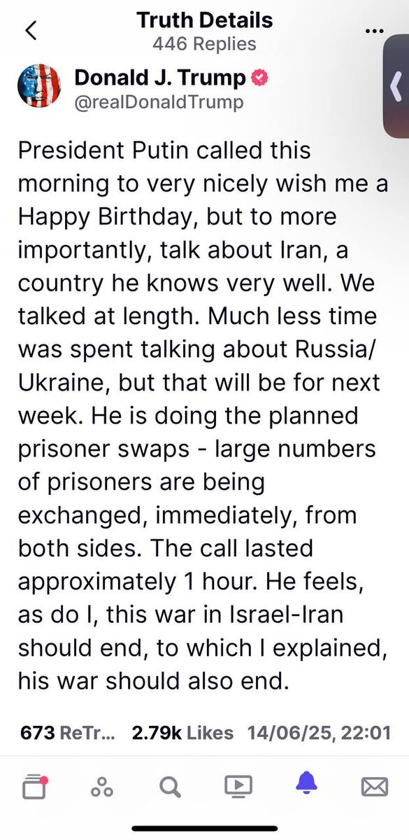 «Президент Путин позвонил мне сегодня утром — поздравил с днём рождения (очень вежливо), но главное — чтобы поговорить об Иране, стране, которую он хорошо знает. Мы говорили долго.