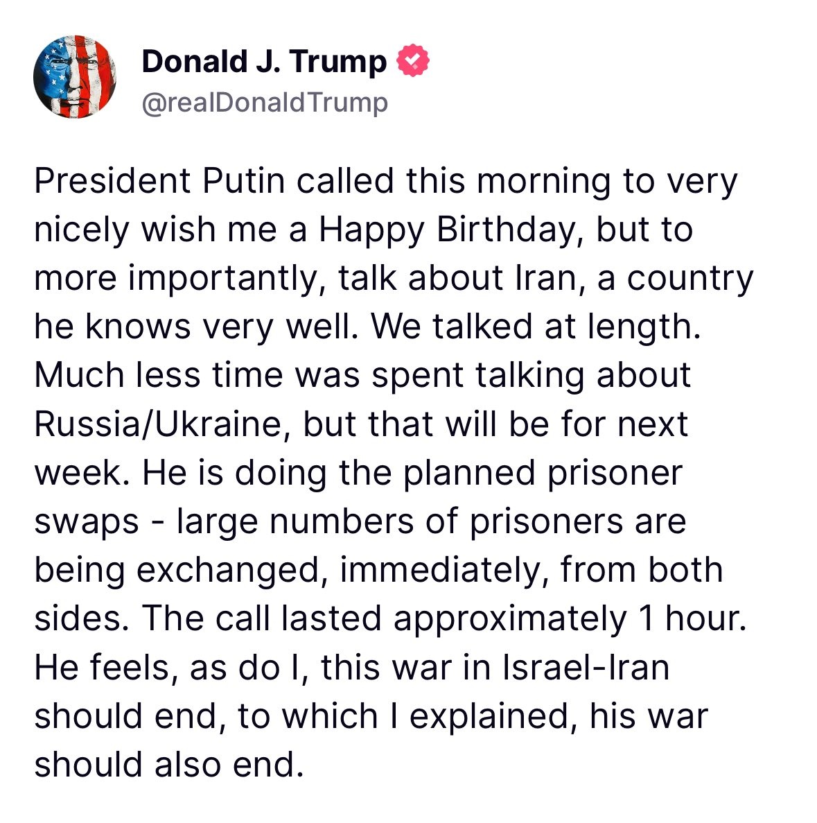 🟨 Պուտինը, ինչպես ես, կարծում է, որ Իսրայելի և Իրանի միջև այս պատերազմը պետք է ավարտվի։ ▫️Ես նրան բացատրեցի, որ նրա պատերազմը նույնպես պետք է ավարտվի։ Դոնալդ Թրամփ