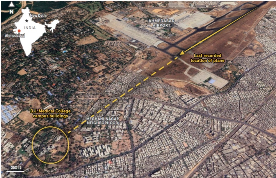 Авиакатастрофы редко заканчиваются спасением хоть кого-то из пассажиров. В рассказываемой нами истории самолёт рухнул почти сразу после взлёта. Схема крушения ниже: Остается неясным, что стало причиной крушения самолета. По словам представителя больницы, отказавшегося назвать свое имя, поскольку она не уполномочена общаться со СМИ, жертвами, скорее всего, также станут люди, получившие ранения или погибшие после того, как самолет или его части врезались в кафетерий общежития для студентов медицинского колледжа BJ в Ахмадабаде. Федерация индийских медицинских ассоциаций Индии (FAIMA) сообщила на телеканале X , что в больницу поступили 50 студентов-медиков, по меньшей мере четыре студента пропали без вести и по меньшей мере двое находятся в критическом состоянии. Тем не менее в этой страшной авиакатастрофе оказался выживший. Выглядит он довольно неплохо, не получил существенных ожогов, а ведь самолёт был полнотью заправлен и взорвался сразу после взлёта. «Я не могу поверить себе, как я вы