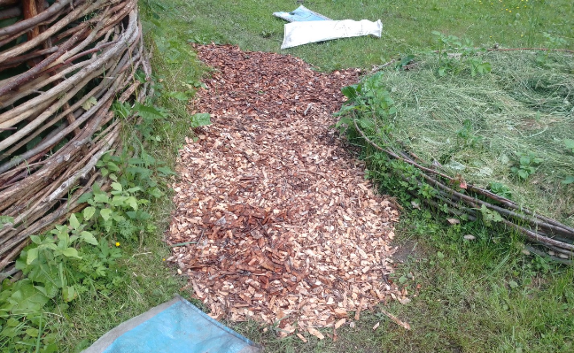 Вообще было бы идеально засыпать сверху ещё и опилками, но это уж как-нибудь потом, а сейчас надо таскать щепу, пока она травой не заросла.