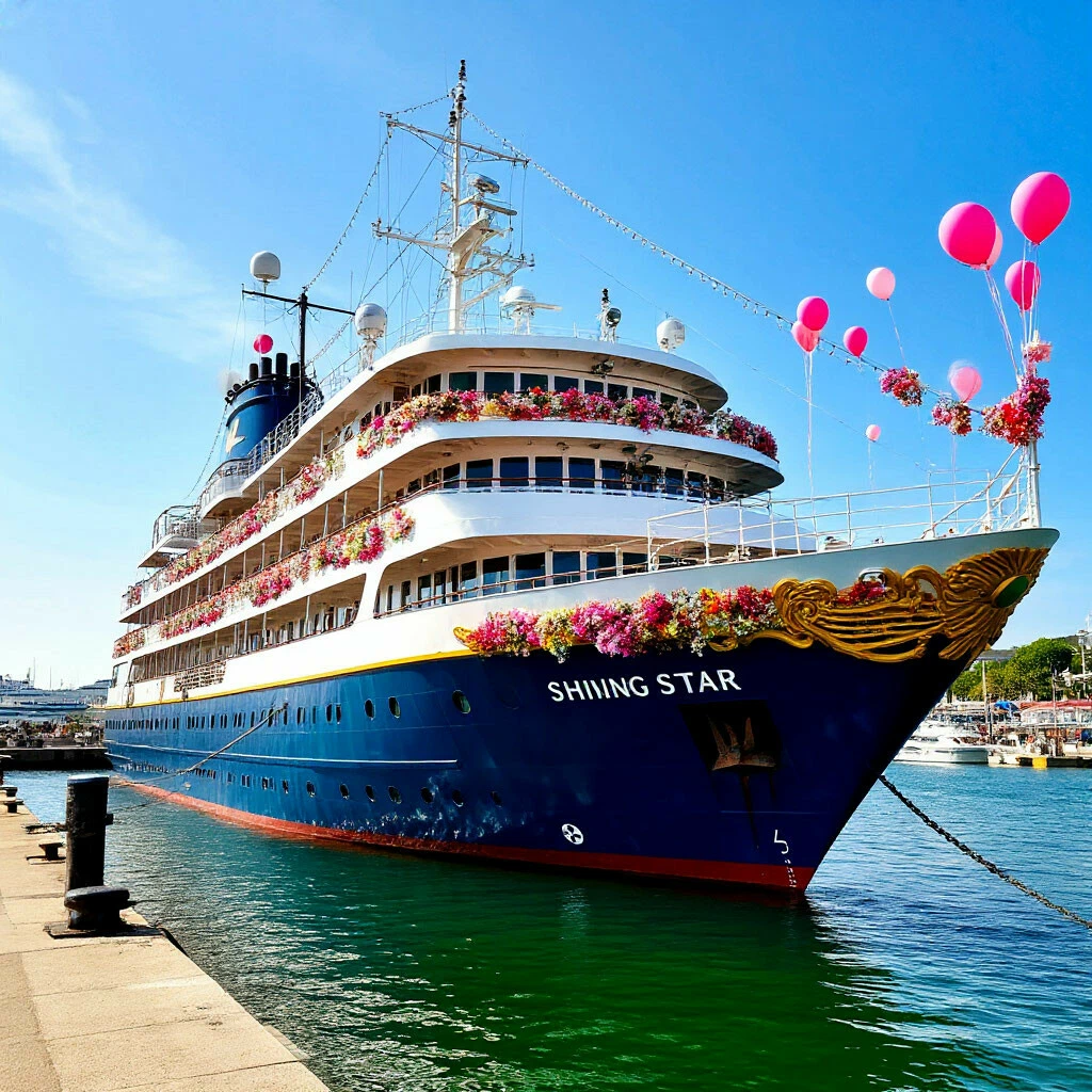 Четырёхпалубный круизный лайнер "Сияющая Звезда" грациозно покачивался на волнах, словно готовился к своему главному рейсу - празднованию любви Валерии и Александра. Его превращение в свадебную площадку было масштабным проектом. Команда корабля, в сотрудничестве с лучшими свадебными декораторами, флористами и организаторами, приложила все усилия, чтобы создать волшебную атмосферу для Валерии и Александра и их гостей. Банкетный зал, расположенный на одной из нижних палуб, был оформлен в элегантном стиле. Белые скатерти, хрустальные люстры и изысканная сервировка создавали атмосферу роскоши и изысканности. На столах стояли букеты из живых цветов, а свечи, мерцающие в полумраке, добавляли романтики. Верхняя палуба, где все должны были веселиться, была украшена живыми цветами и множеством шаров.