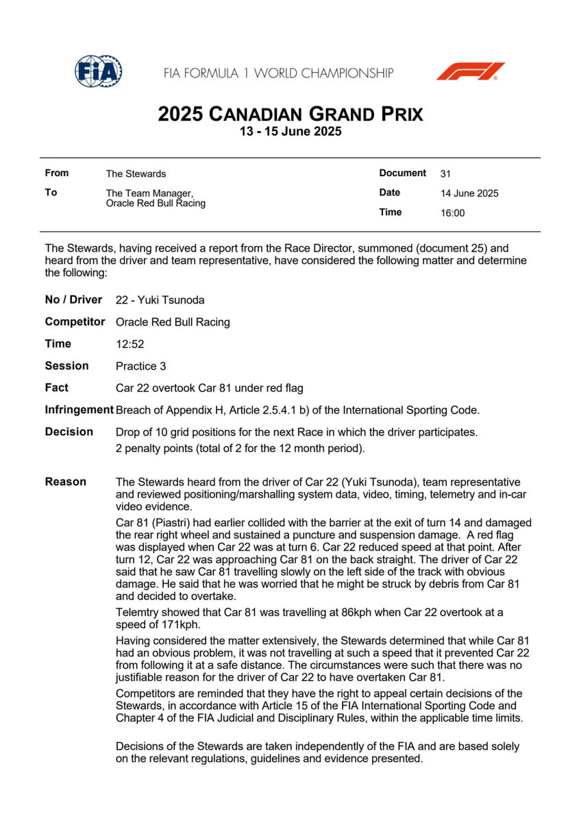 Цунода получает 10 штрафных позиций за обгон под красными флагами во время сегодняшней практики