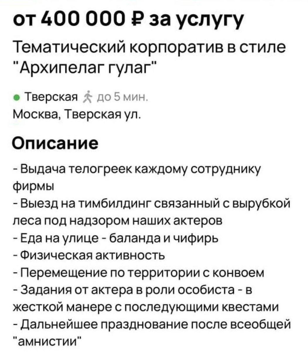 Корпоративы в стиле ГУЛАГ проводят в Москве за 400 тысяч рублей