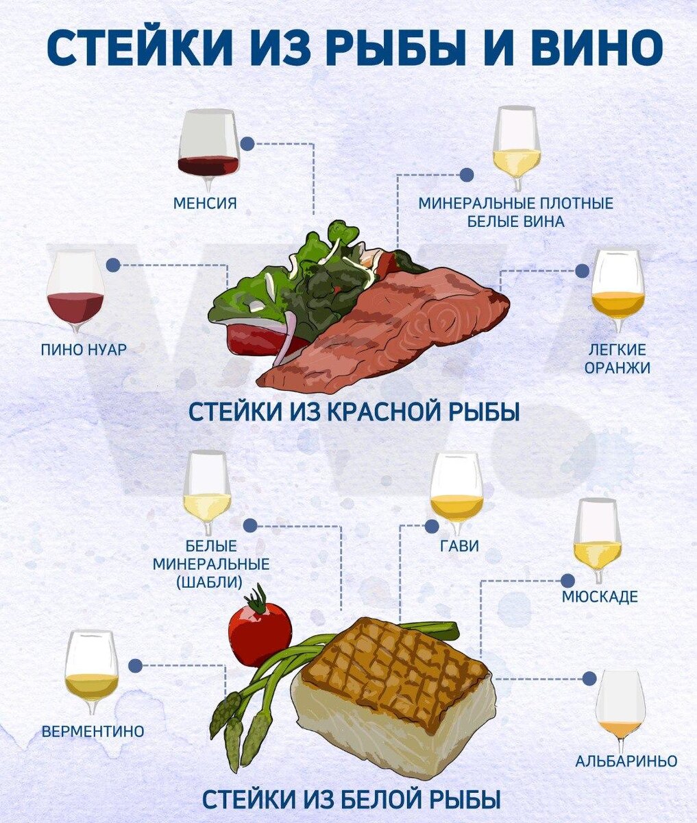 С чем сочетать стейки из рыбы? 🍾Лососевый стейк. Он может быть из любой красной рыбы, хоть семги, хоть форели. Лососи как два разных персонажа в одном: их мясо может быть и шелковисто-сухощавым, и маслянисто-жирным, – лучше выбрать стейк с середины тела, не у хвоста. Здесь важен каждый градус прожарки, капля маринада, секунда подачи вина-партнера. Берем: плотные белые с выраженной минеральностью, легкие оранжи, пино нуары и менсии 🍾Стейки из белой рыбы. Палтус чаще всего – но почему бы и не сибас или треска? У них чистый «белый» вкус, мало жира, слоистая текстура, поэтому акцент обычно делают на соус Берем: белые, как шабли, с выраженной минеральностью и лаймовой кислотностью, приморские белые, от альбариньо до верментино и мюскаде, гави