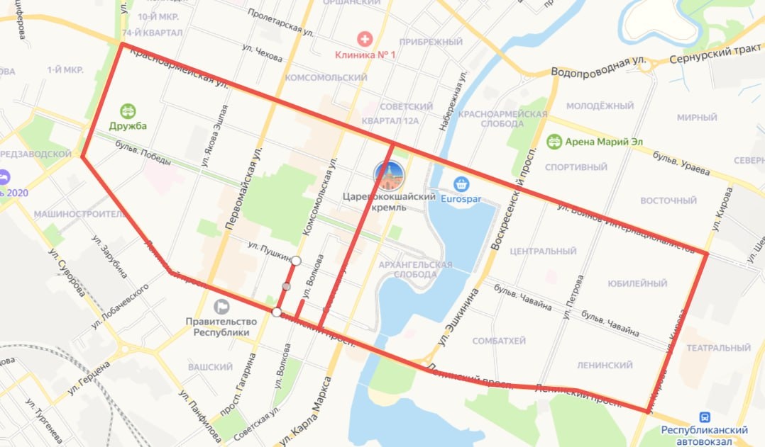 ⛔️ В связи с проведением велопарада «Эвелин» сегодня на несколько часов перекроют центр Йошкар-Олы ❌ Улица Волкова уже перекрыта до 14 часов на участке от Ленинского проспекта до улицы Гоголя, ❌ Улица Комсомольская перекрыта до 20 часов на участке от улицы Пушкина до Ленинского проспекта. С 11:55 до 14:00 будет запрещено движение всех видов транспортных средств по улицам Йошкар-Олы согласно схеме 👆