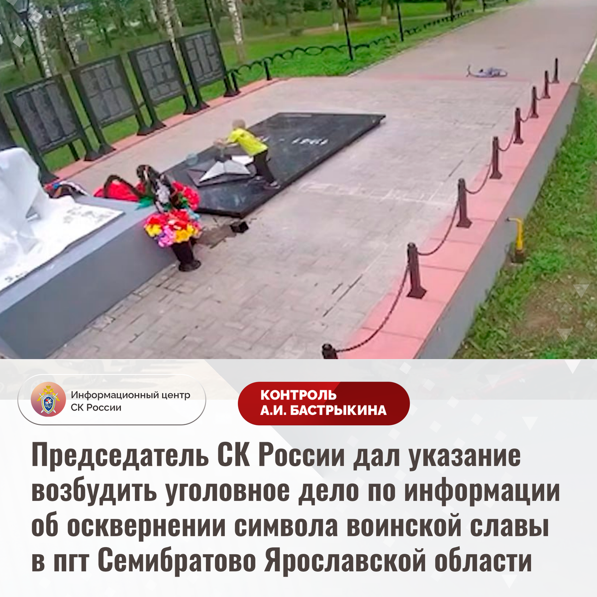 Председатель СК России дал указание возбудить уголовное дело по информации об осквернении символа воинской славы в пгт Семибратово Ярославской области