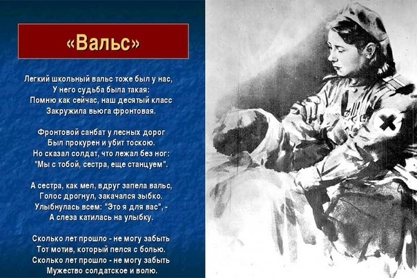 «Не могу забыть» (Вальс фронтовой медсестры»). История песни В годы Великой Отечественной за жизнь советских воинов боролось неисчислимо много медицинских работников - докторов и медсестер, фельдшеров и санитаров, благодаря усилиям которых удалось вернуть к жизни более 17-и миллионов советских солдат и офицеров, помочь выжить большому числу получивших ранения и вернуть их к своим солдатским обязанностям. Это можно справедливо назвать подвигом, который воспевают в поэмах, стихах и трогательных песнях. Незабываемая композиция, о которой хочу рассказать сегодня, продолжая на канале цикл публикаций о песнях нашей Победы, возвращает в далёкие сороковые к мальчишкам и девчонкам, едва окончившим десятый класс. У песни авторов: композитора Давида Тухманова и поэта Владимира Харитонова, по легенде созданной в честь советского разведчика Рихарда Зоргфальта, за которым ухаживала героиня композиции - сестра милосердия, несколько названий «Не могу забыть», «Военный вальс» или «Вальс фронтово