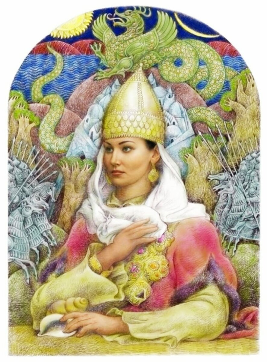 «Перед нашими божественными предками Чингисханом и Аттилой весь мир трепетал, — говорит ханбика. — Нас считали скифами во всем мире. Вы наследники этого народа, который славился и прославлялся среди всех народов? Когда-то только с нашего разрешения вы садились на трон и всегда клялись нам в верности, платя дань, а теперь рабы хотят восстать против нас. Теперь Казань уже смотрит на упадок своей силы. Горы не подчиняются нашей воле. Враги пытаются подчинить нас! Кто же угрожает нам, кто пытается нас запугать? Это те народы, которые совсем недавно платили нам дань! Если вы боитесь их, то идите пасти скот! Забывайте о своих славных предках! Забывайте о своей родине! Или пробуждайтесь, будьте как скифы!» [Указанное произведение].