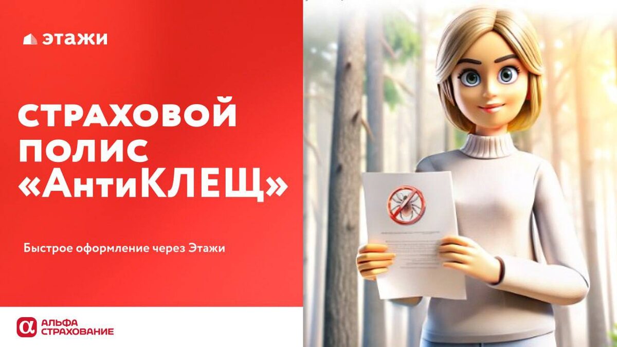 😉 Я не перепутал канал, не переживайте) "Этажи" предлагают широкий перечень услуг: от узаконивания перепланировки до декорирования квартиры и, конечно, страхования. А страховать можно не только жильё, но и жизнь и здоровье. В частности, в сезон пикников, прогулок и поездок на дачу есть риск укуса клеща . Хорошая новость! Теперь можно оформить страховой полис «АнтиКЛЕЩ» от Альфа-Страхование. Что важно знать: Стоимость полиса: от 390 ₽ Срок действия: 1 год Быстрое оформление онлайн Описание программы: лечение клещевых инфекций; лабораторные исследования клеща; введение иммуноглобулина; стационарное и реабилитационно-восстановительное лечение; компенсация затрат на лечение; экстренная госпитализация. Будьте готовы к неожиданностям — оформите страховой полис «АнтиКЛЕЩ»